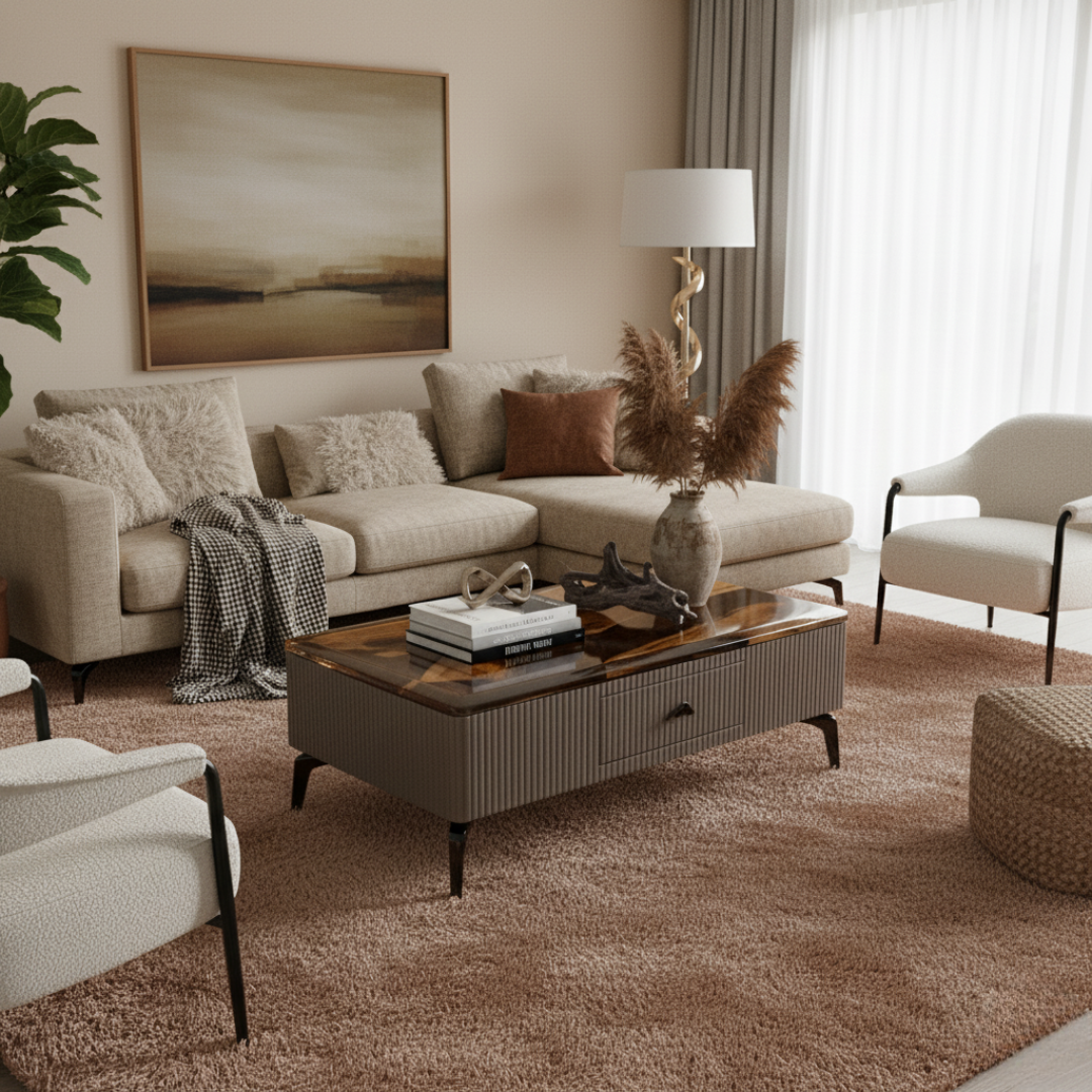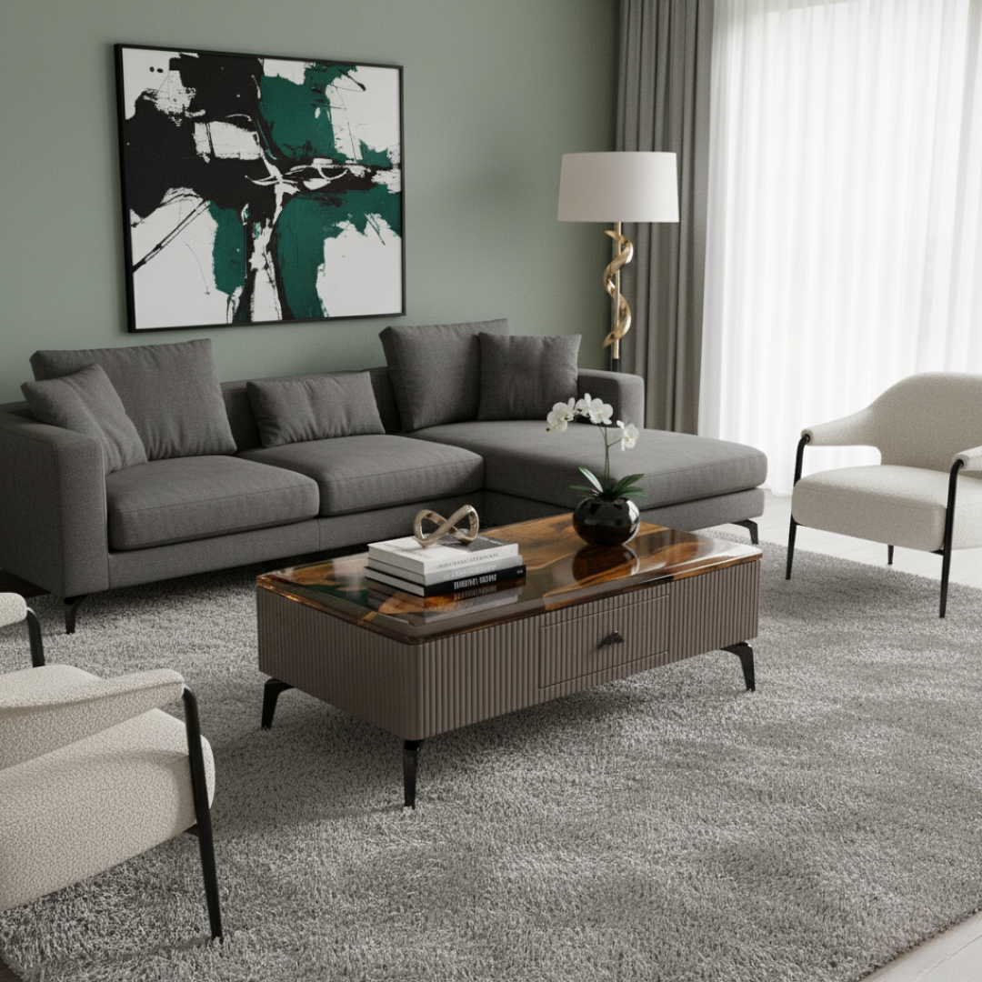 Mixed Material Design: The combination of natural wood, artistic resin, textured cabinet work, and sleek metal/lacquered legs offers a sophisticated, contemporary aesthetic.