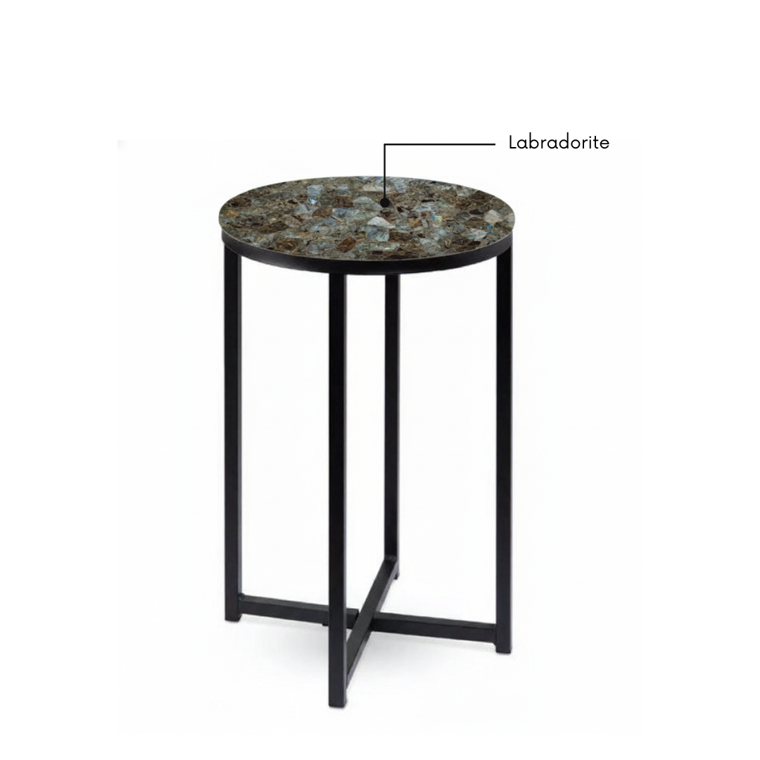 Exotic Labradorite Top: Features a stunning semi-precious stone surface known for its iridescent flashes of blue, gold, and green (labradorescence).